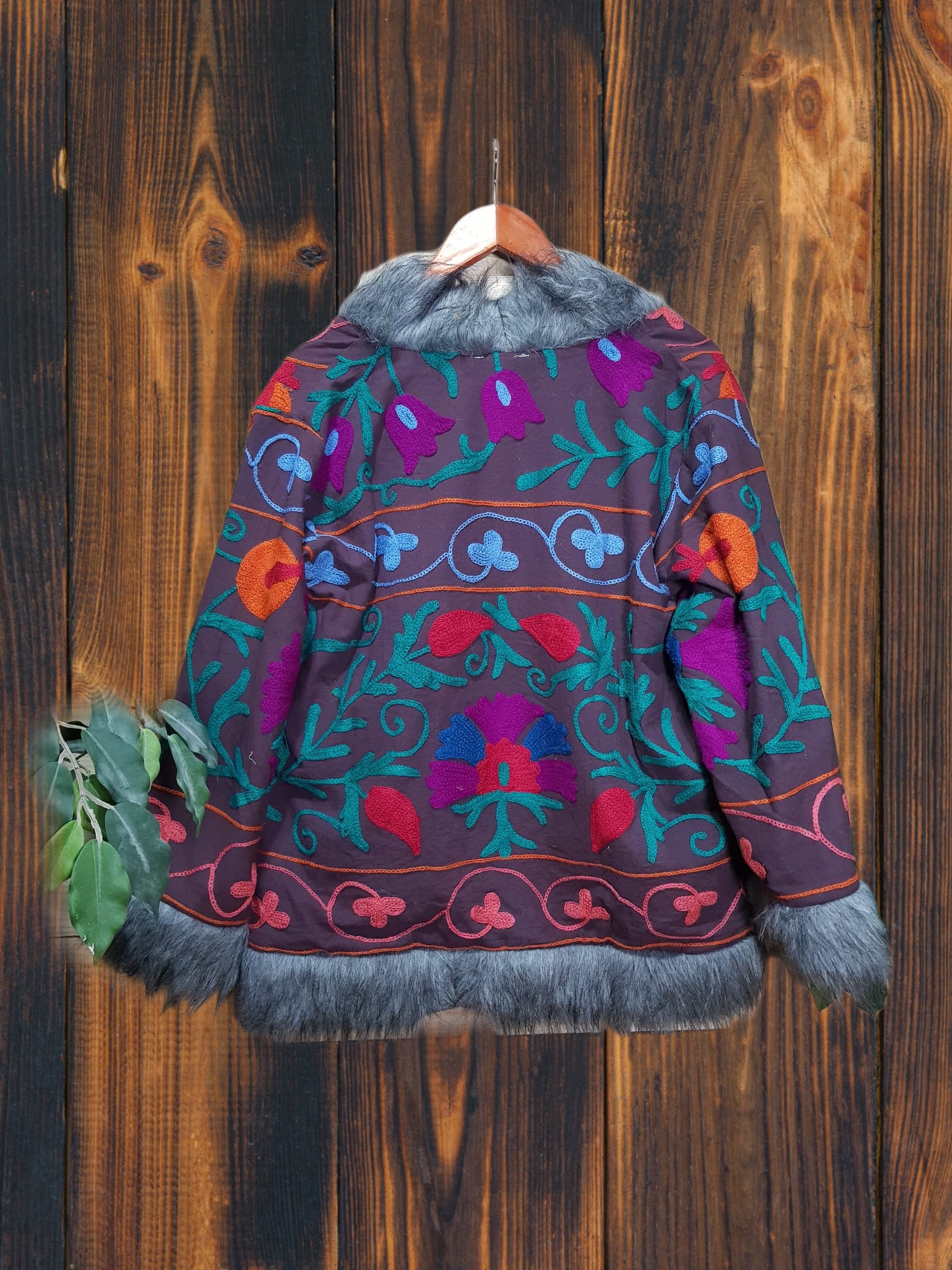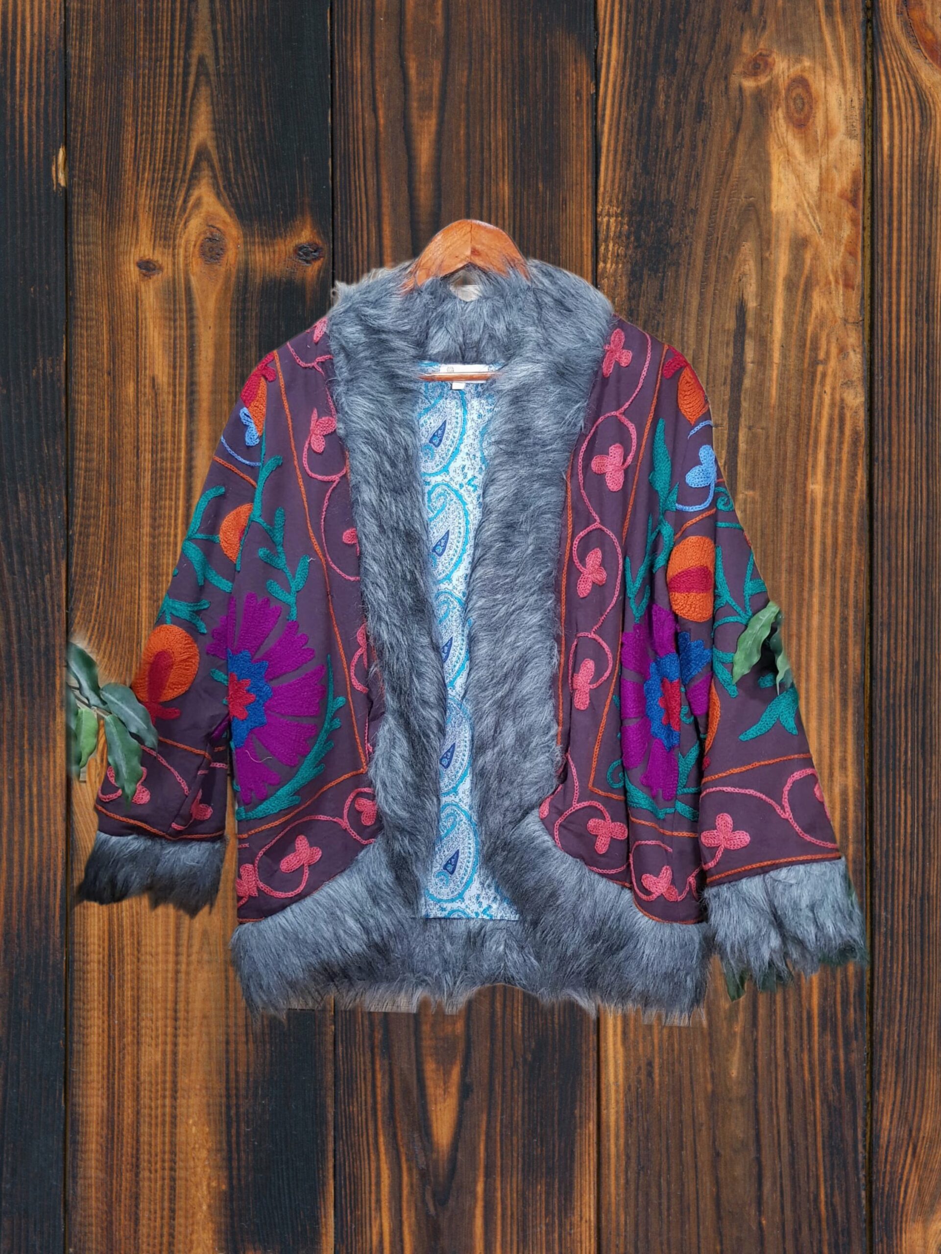 Magnífico abrigo bordado, filo y cuello de pelo sintético.