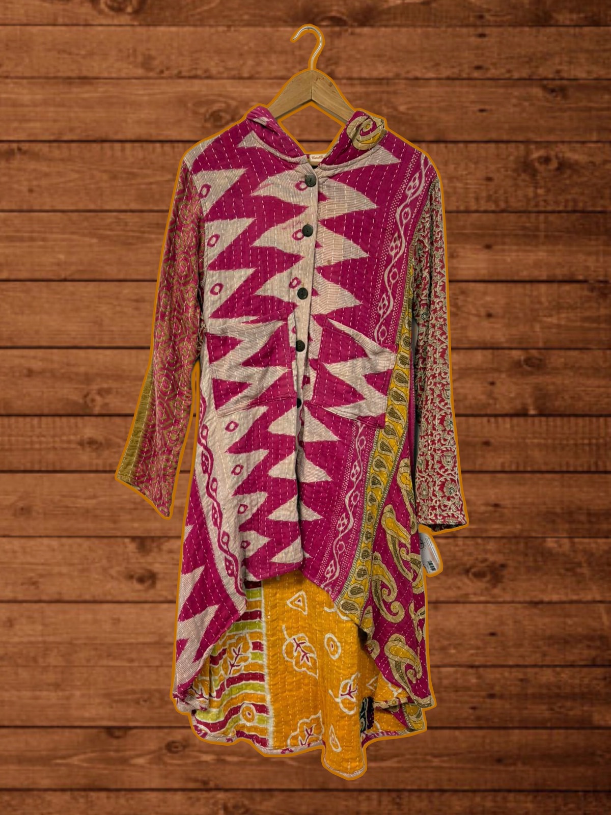 Abrigo asimétrico con capucha y botones de madera. Lleva bolsillos. Algodón reciclado patchwork vintage.
