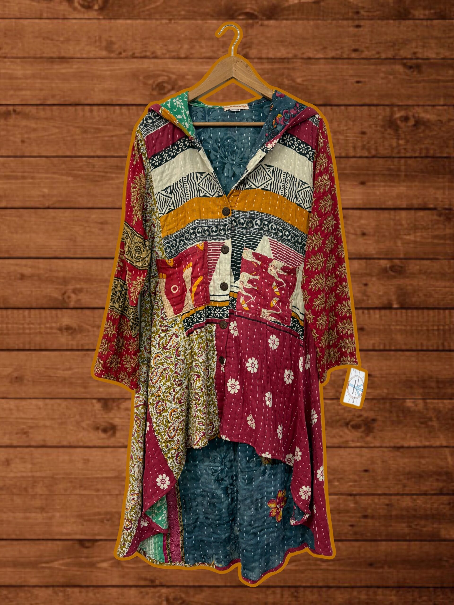 Abrigo asimétrico con capucha y botones de madera. Lleva bolsillos. Algodón reciclado patchwork vintage.