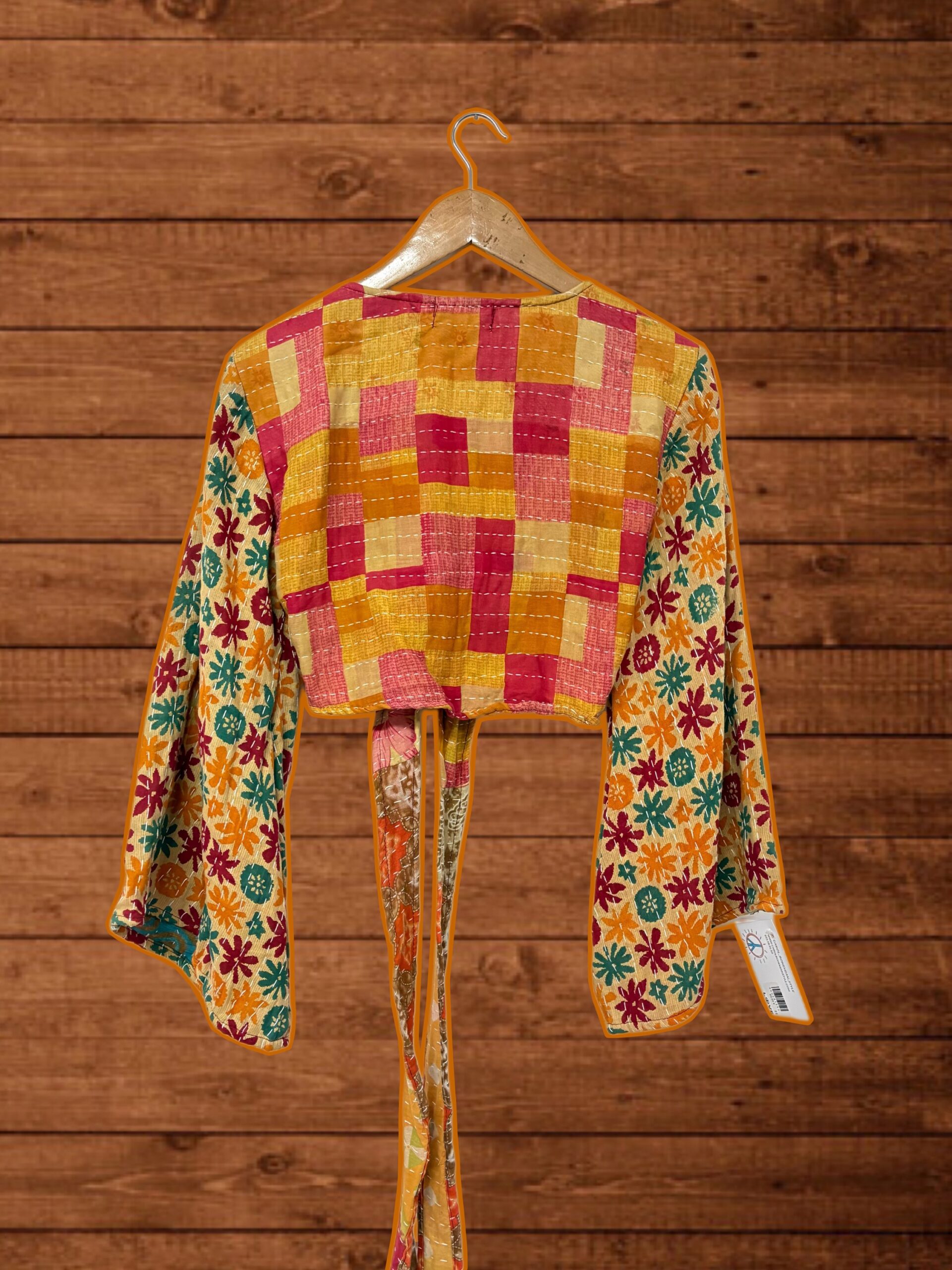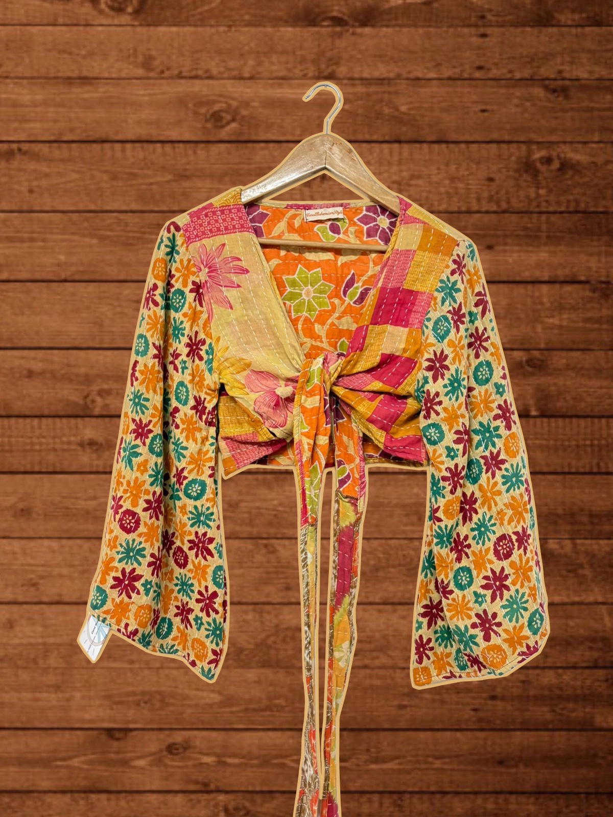 Blusa cruzada con mangas acampanadas. Algodón reciclado patchwork vintage.