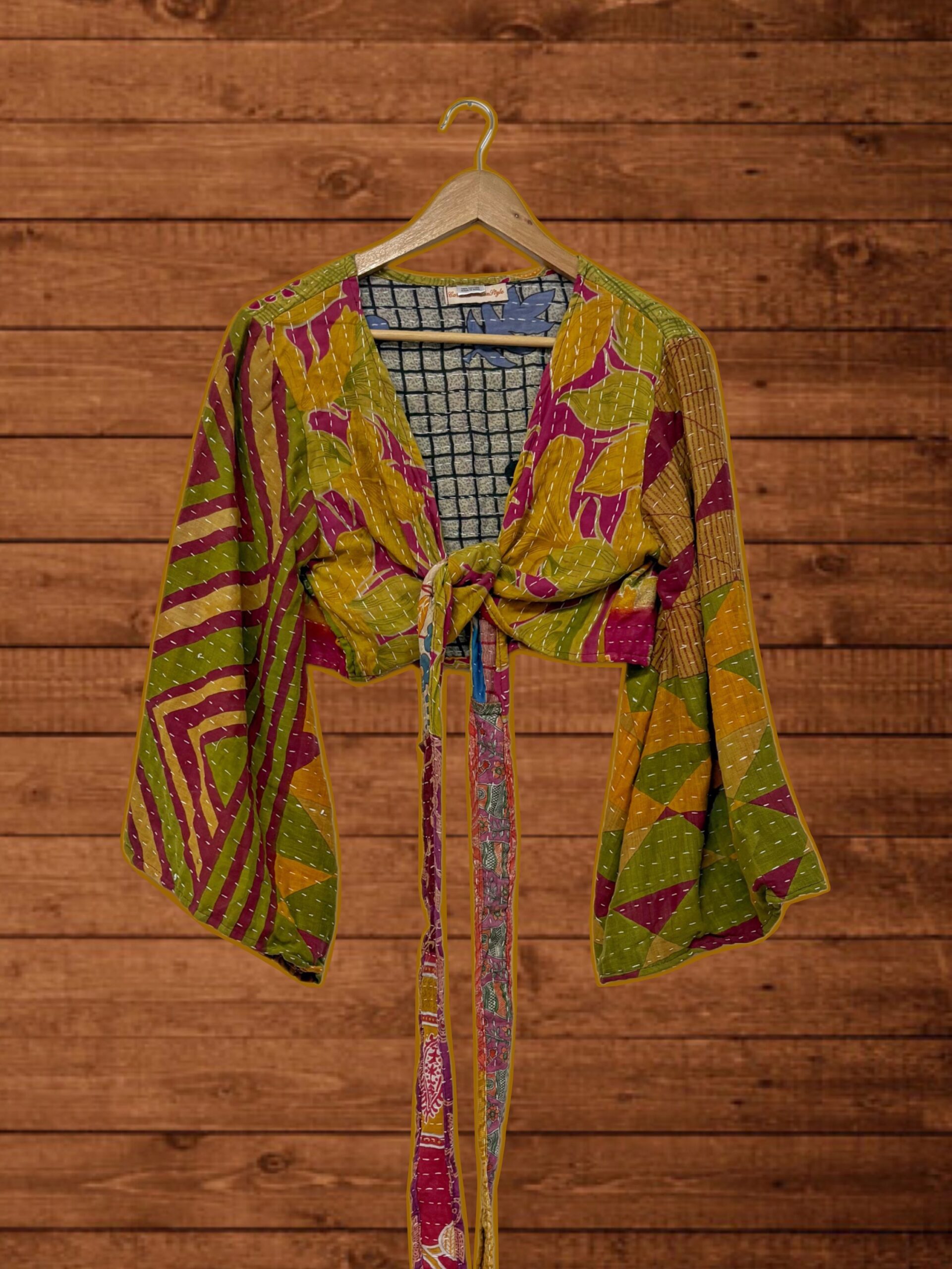 Blusa cruzada con mangas acampanadas. Algodón reciclado patchwork vintage.