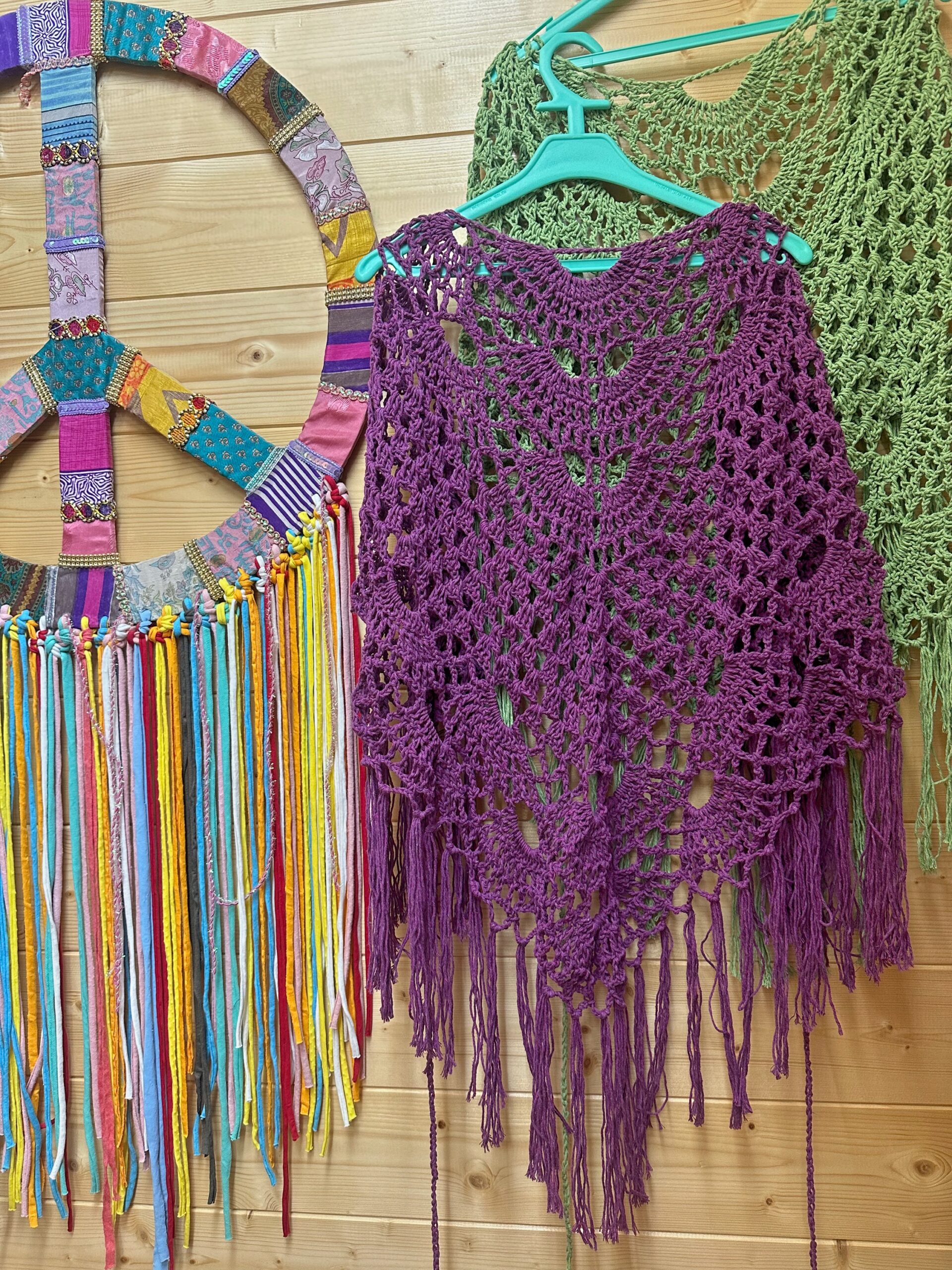 Bonito chal de flecos con pico morado. Lleva cordón para poner de pareo.