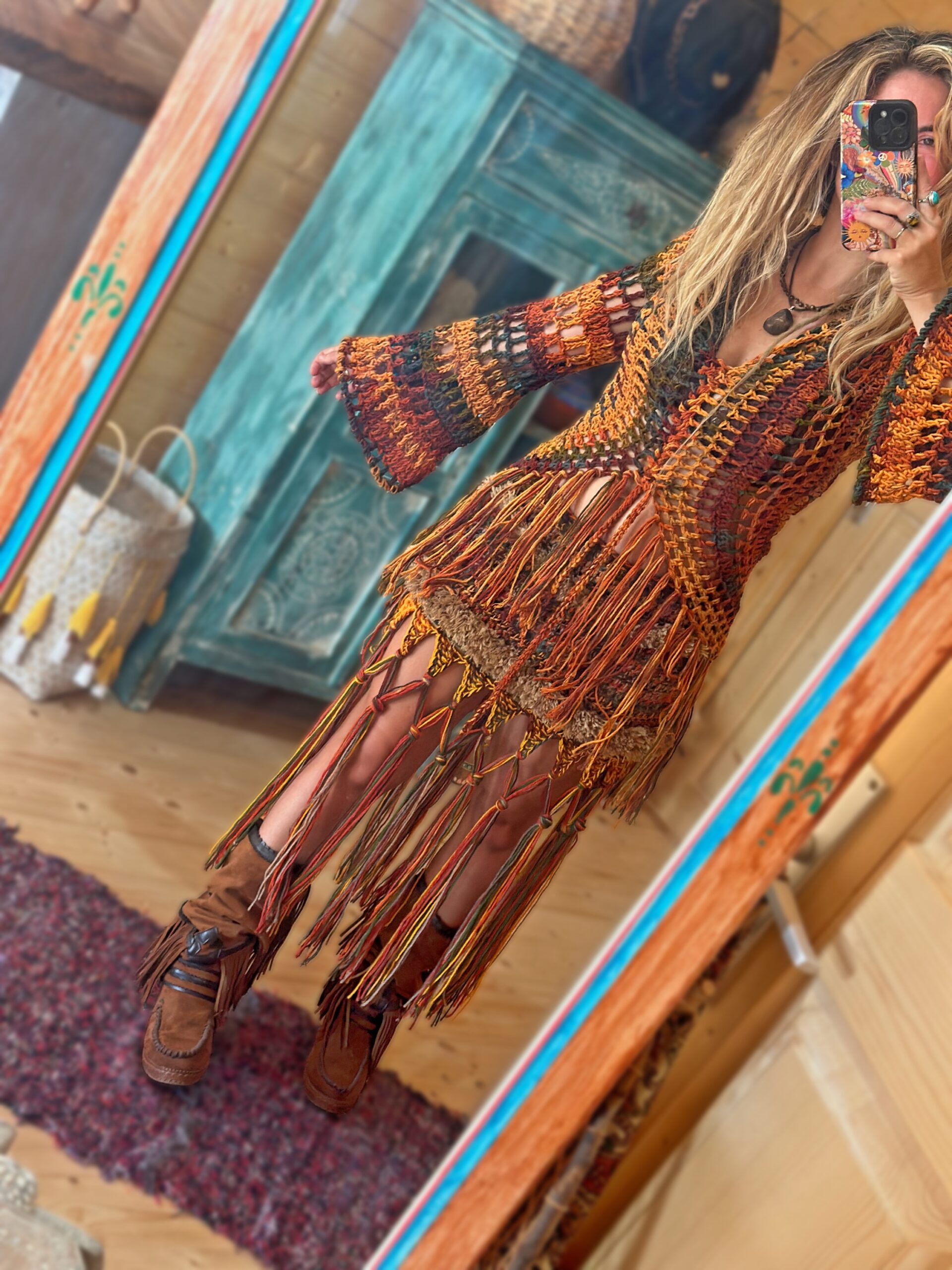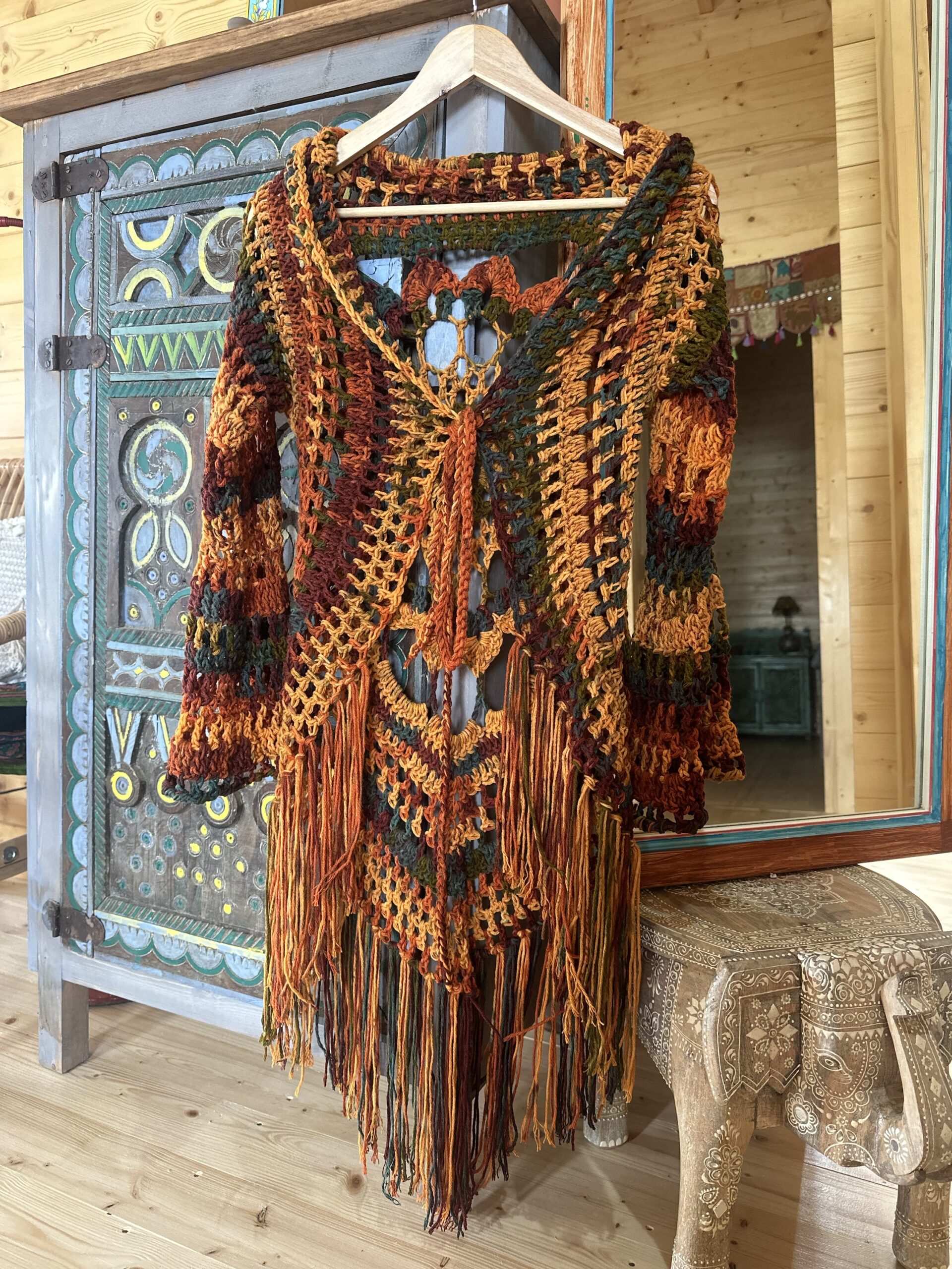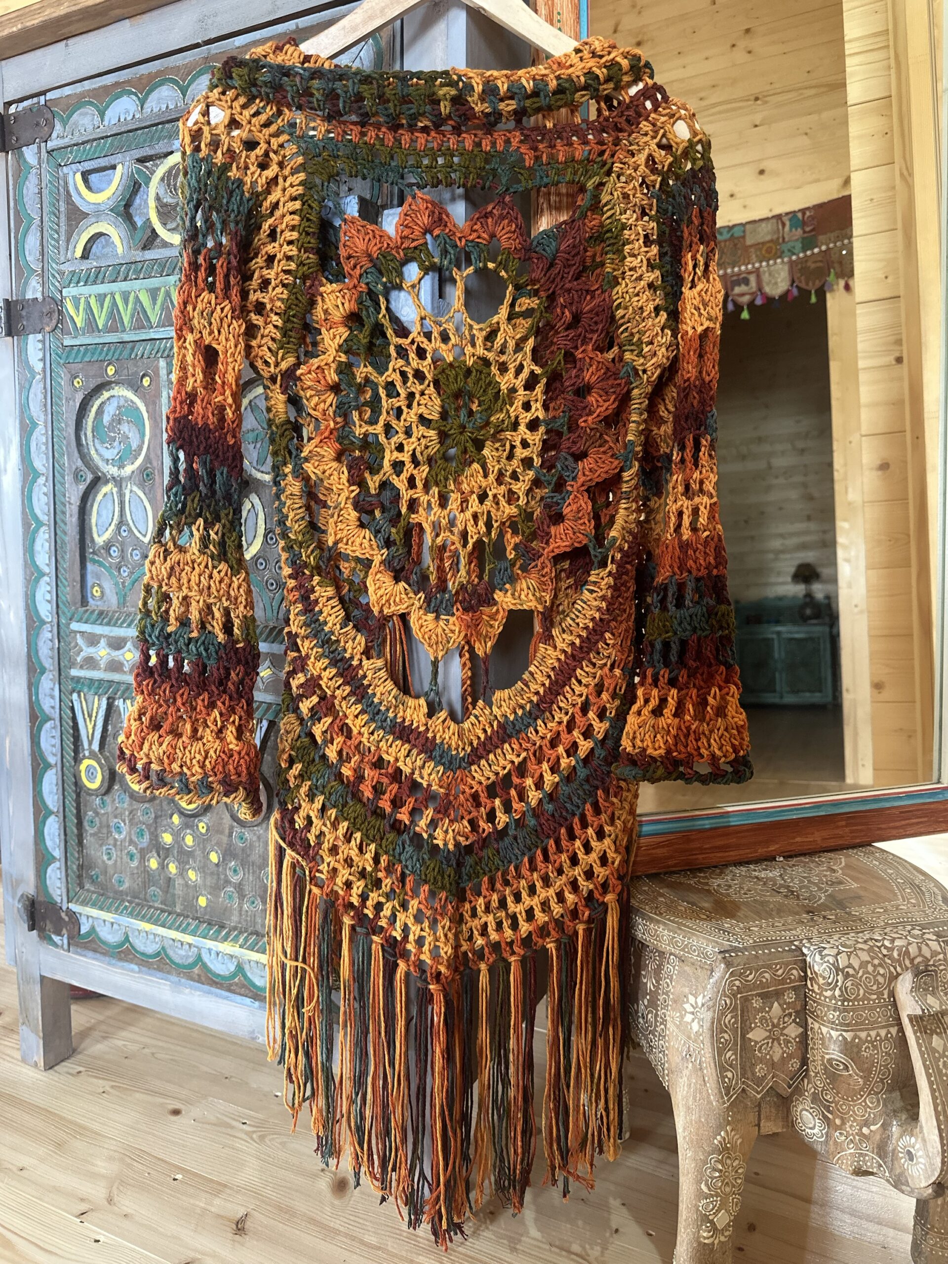 Preciosa chaqueta con flecos y mandala en la espalda.