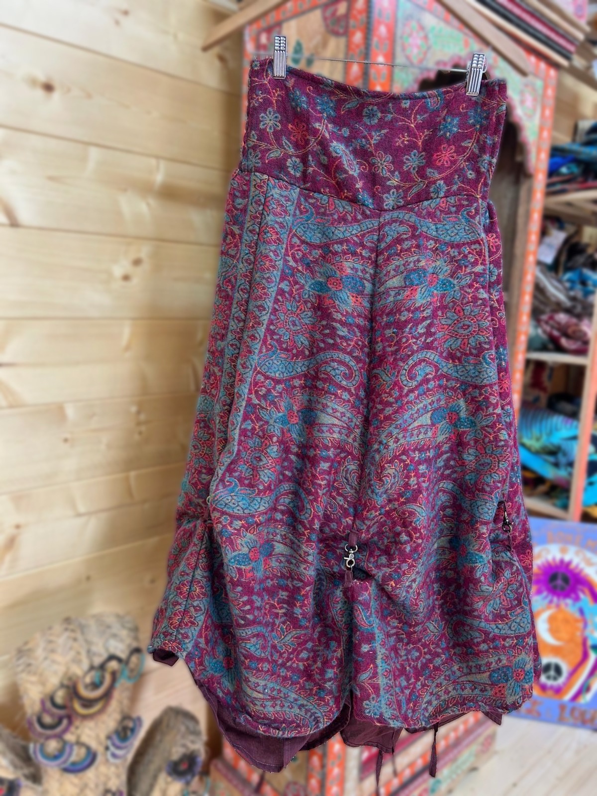 Preciosa falda de paño con elástico en la zona trasera de la cintura para ajustar . En su interior lleva forro de algodón con cintas para atar y dar efectos.