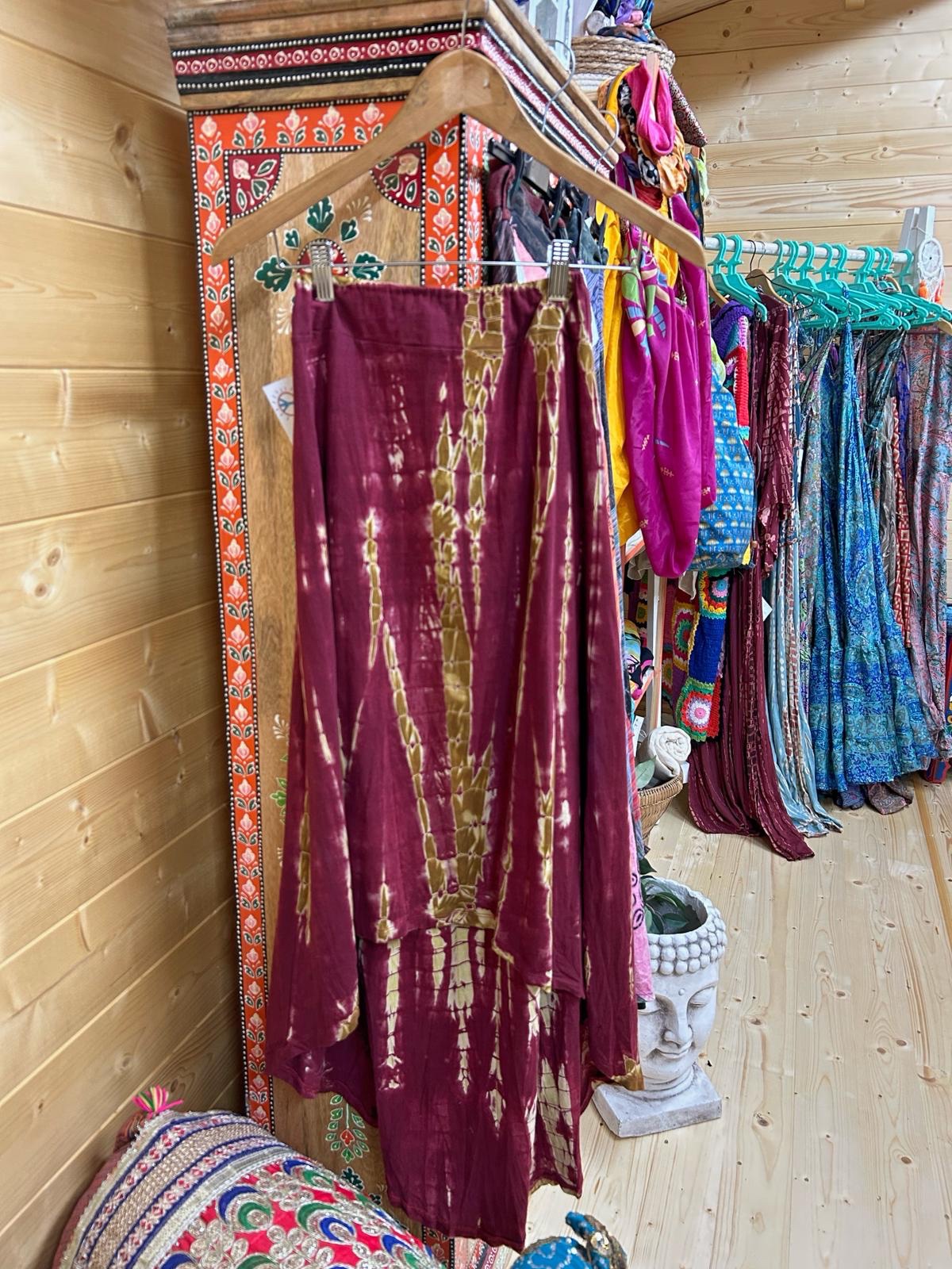 Falda Tie Dye de algodón y licra asimétrica. Elástico en el contorno de cintura.