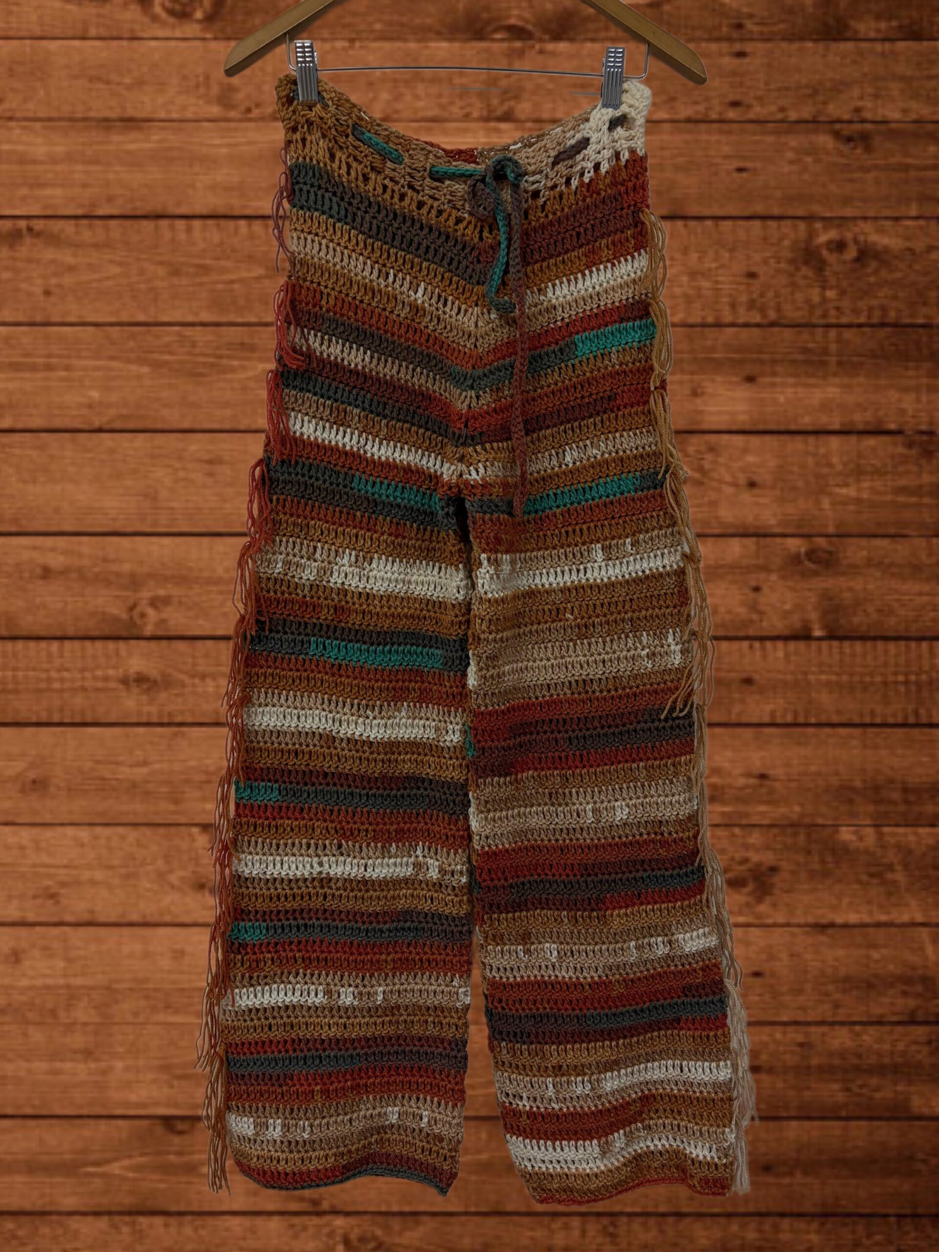 Pantalón de crochet con flecos a los laterales y colores pistacho, malva y naranja.