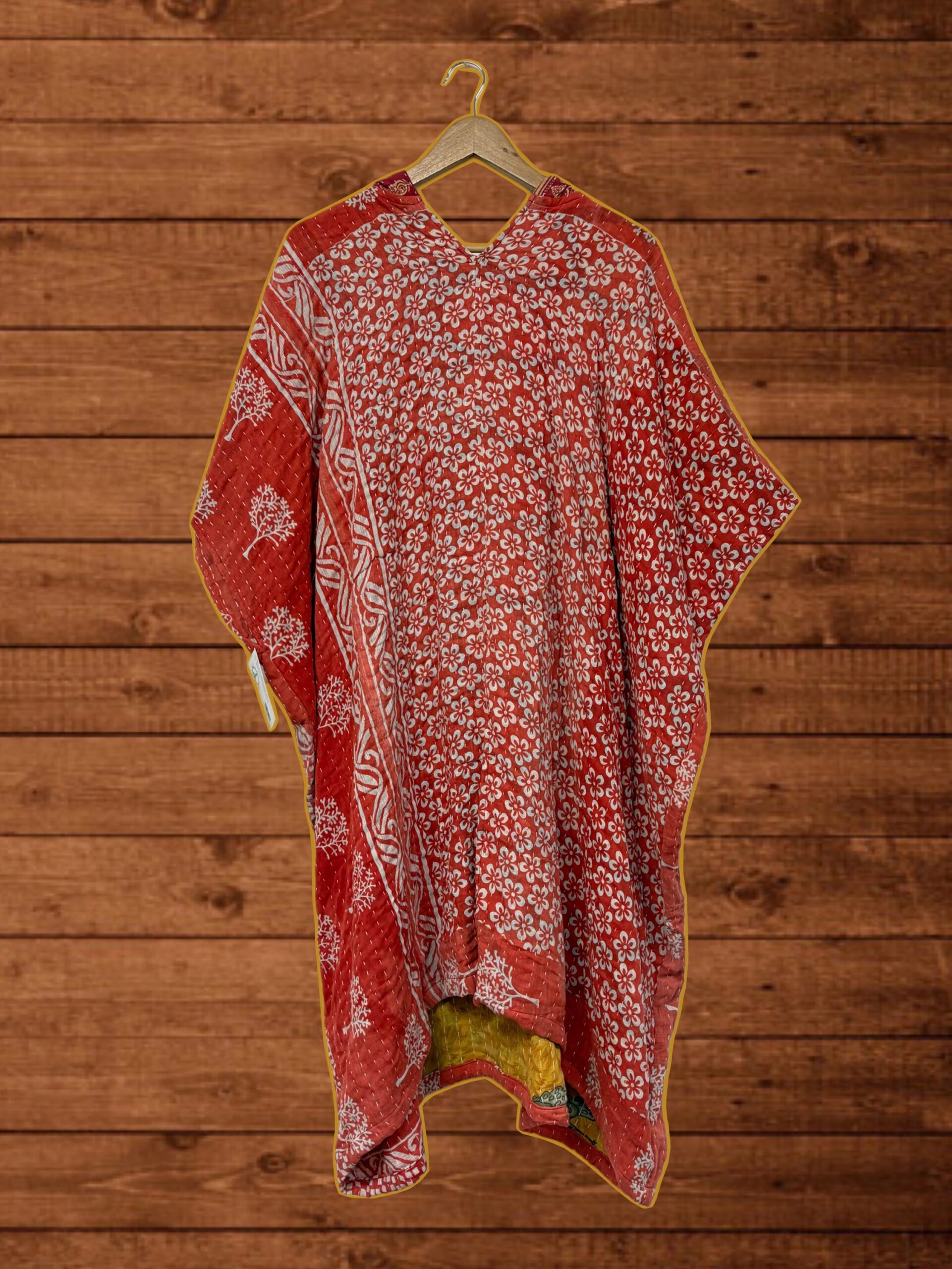 Poncho con capucha y apertura delante. Algodón reciclado patchwork vintage.
