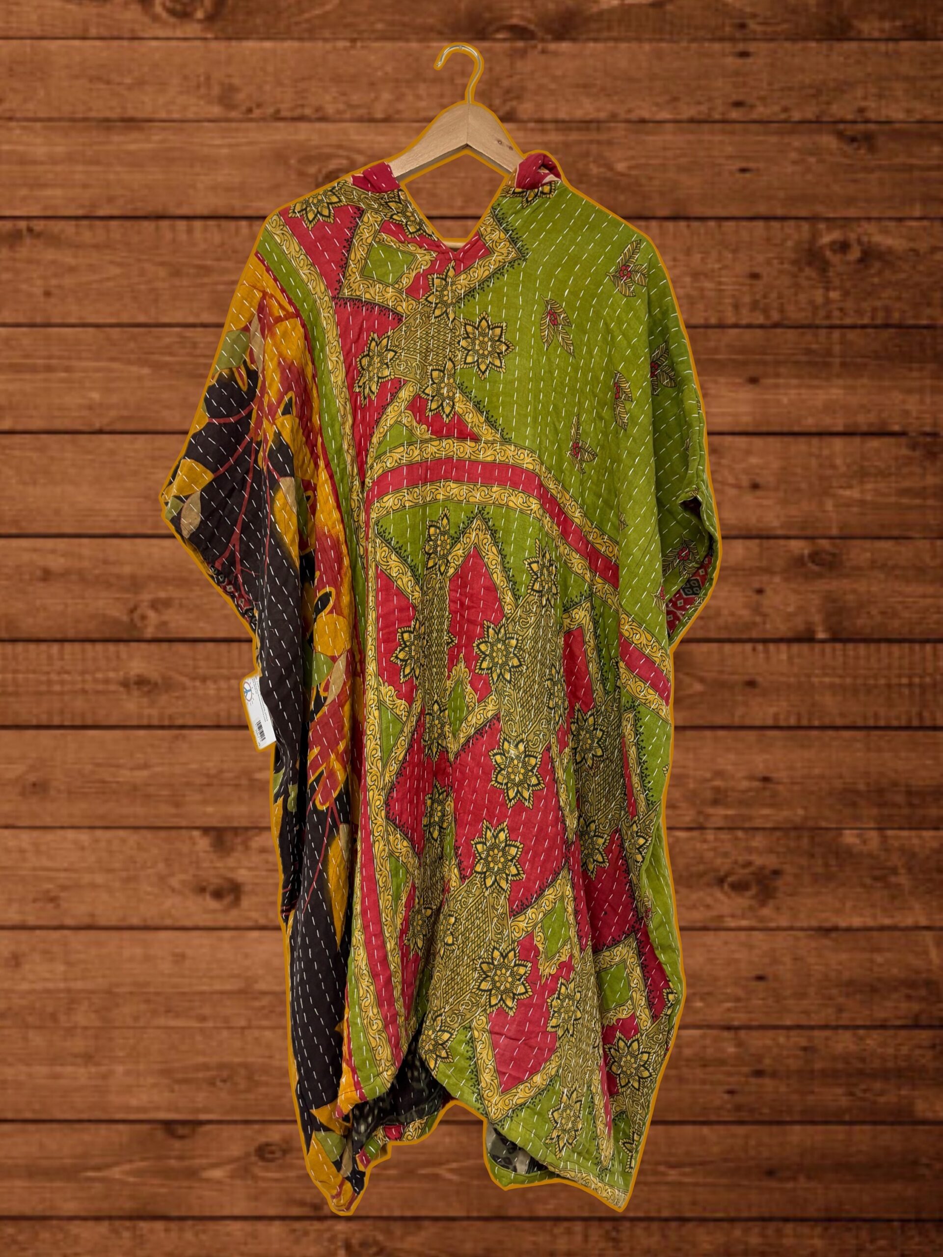 Poncho con capucha y apertura delantera. Algodón reciclado patchwork vintage.
