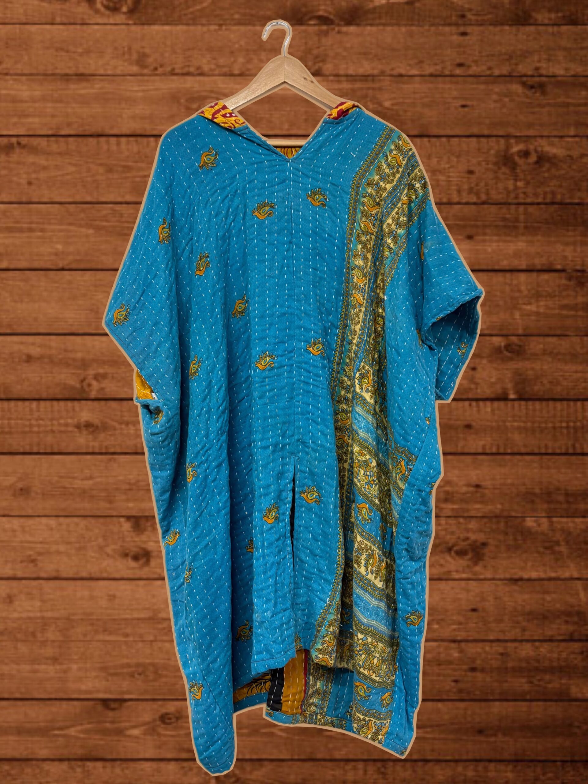 Poncho con capucha y apertura delantera. Algodón reciclado patchwork vintage.
