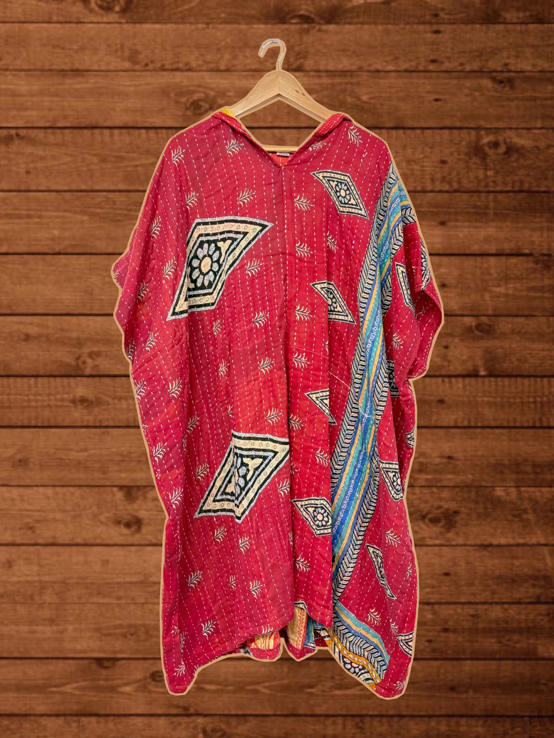 Poncho con capucha y apertura delante. Algodón reciclado patchwork vintage.