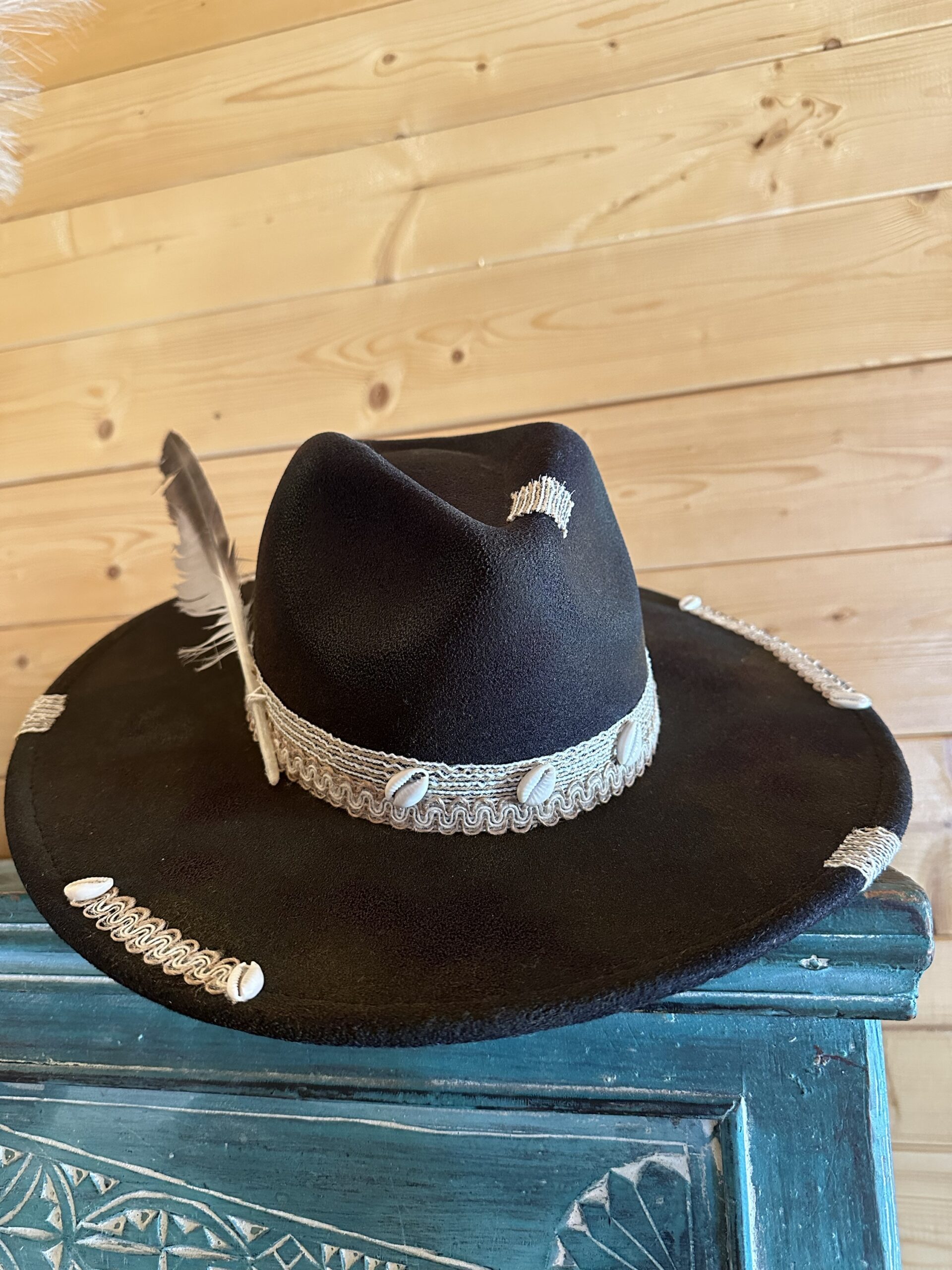 Espectacular sombrero teñido a mano y envejecido. Negro con conchas, detalles elegantes beige y gran pluma natural. En la zona posterior de la visera lleva nuestras míticas plumas grabadas. Esto hace que el sombrero luzca de una forma bonita una vez colocado.