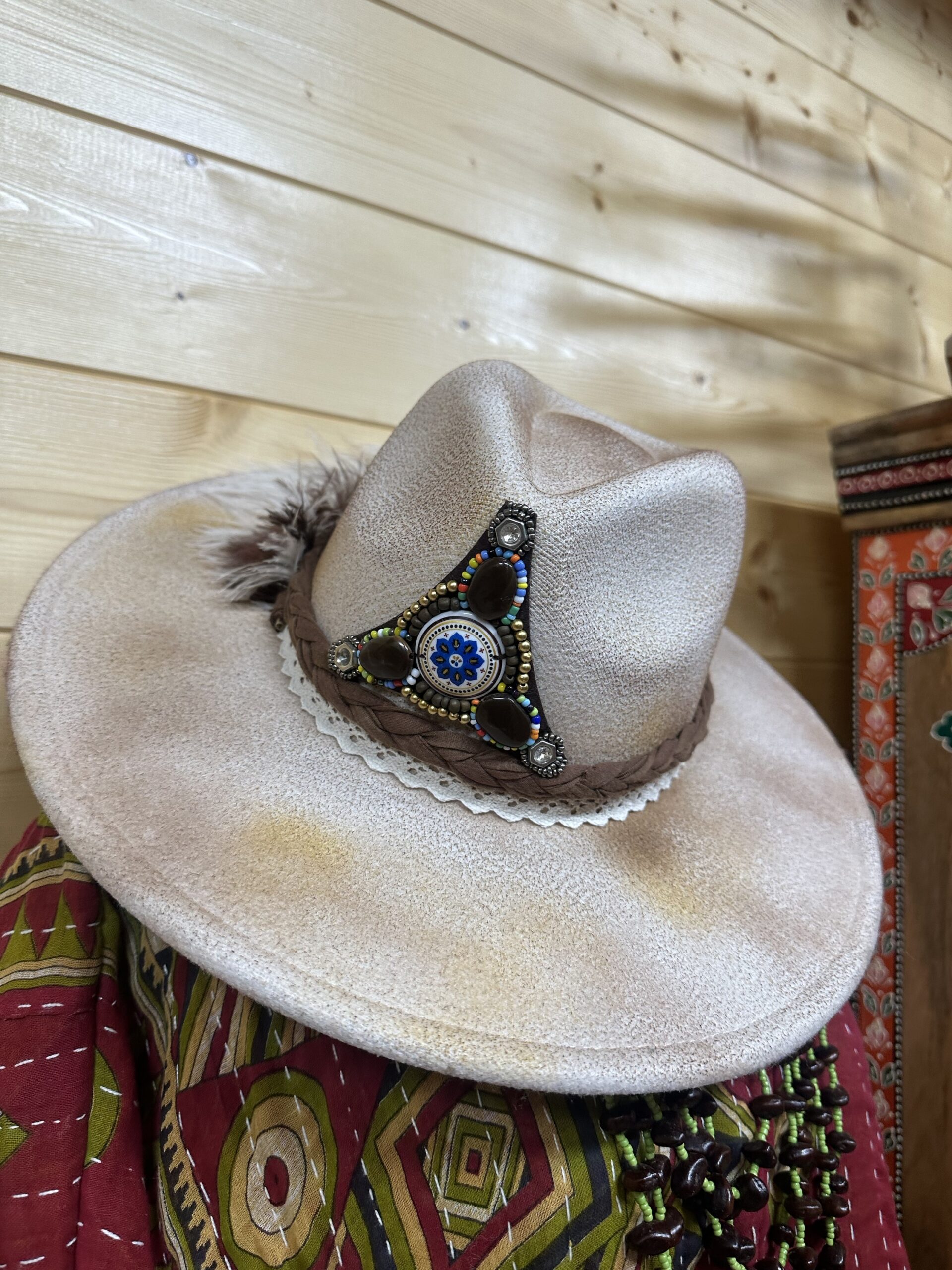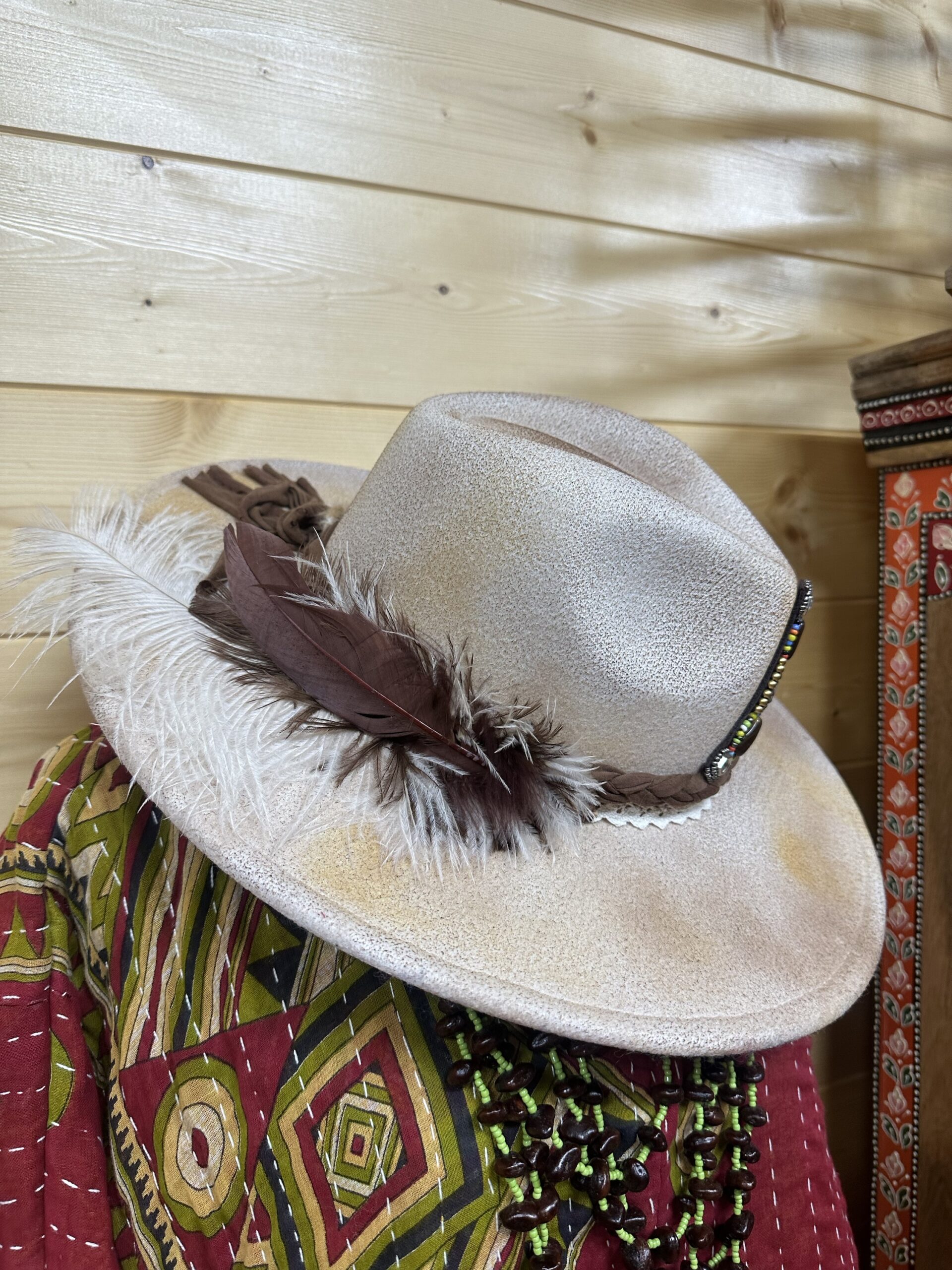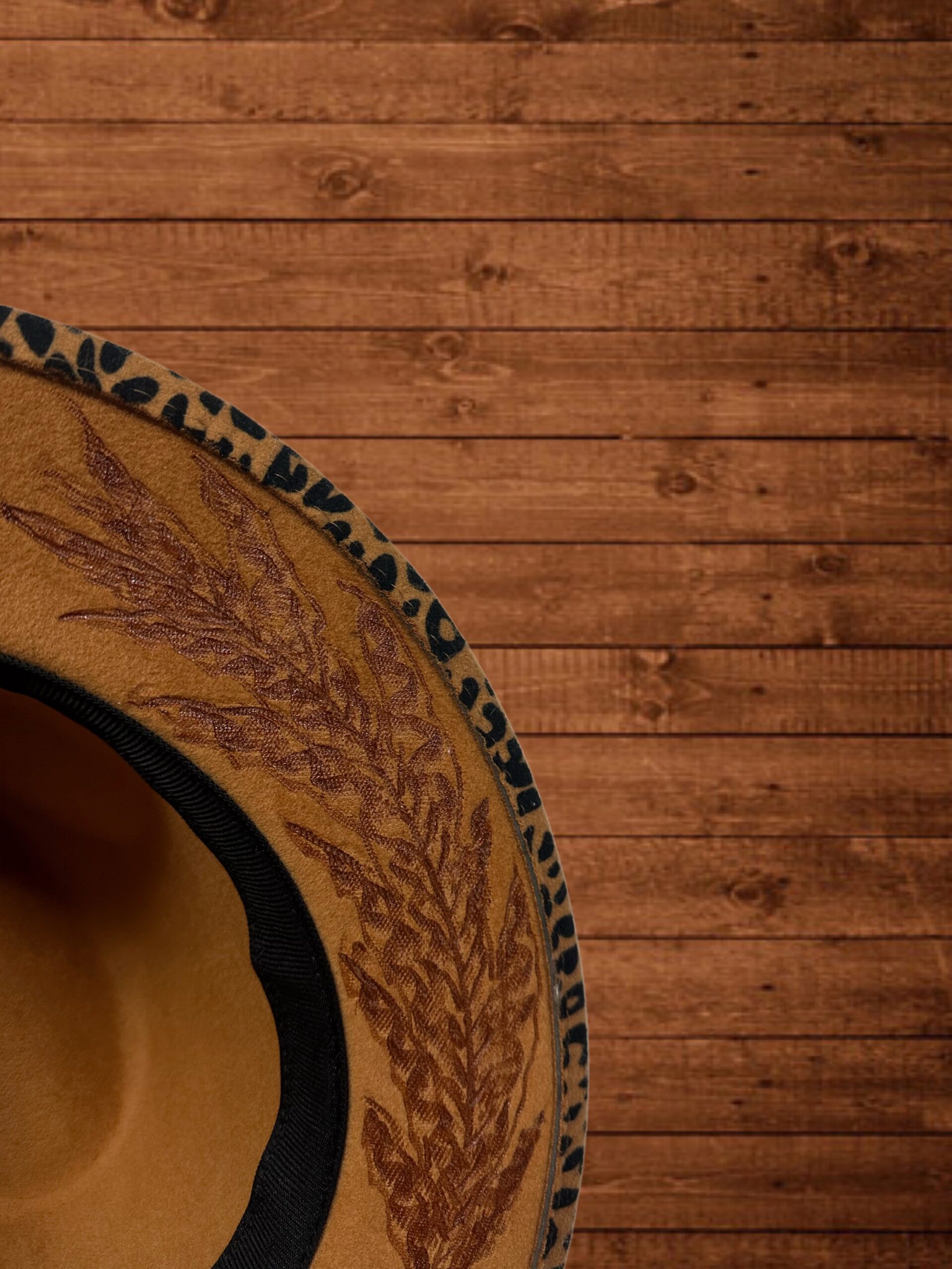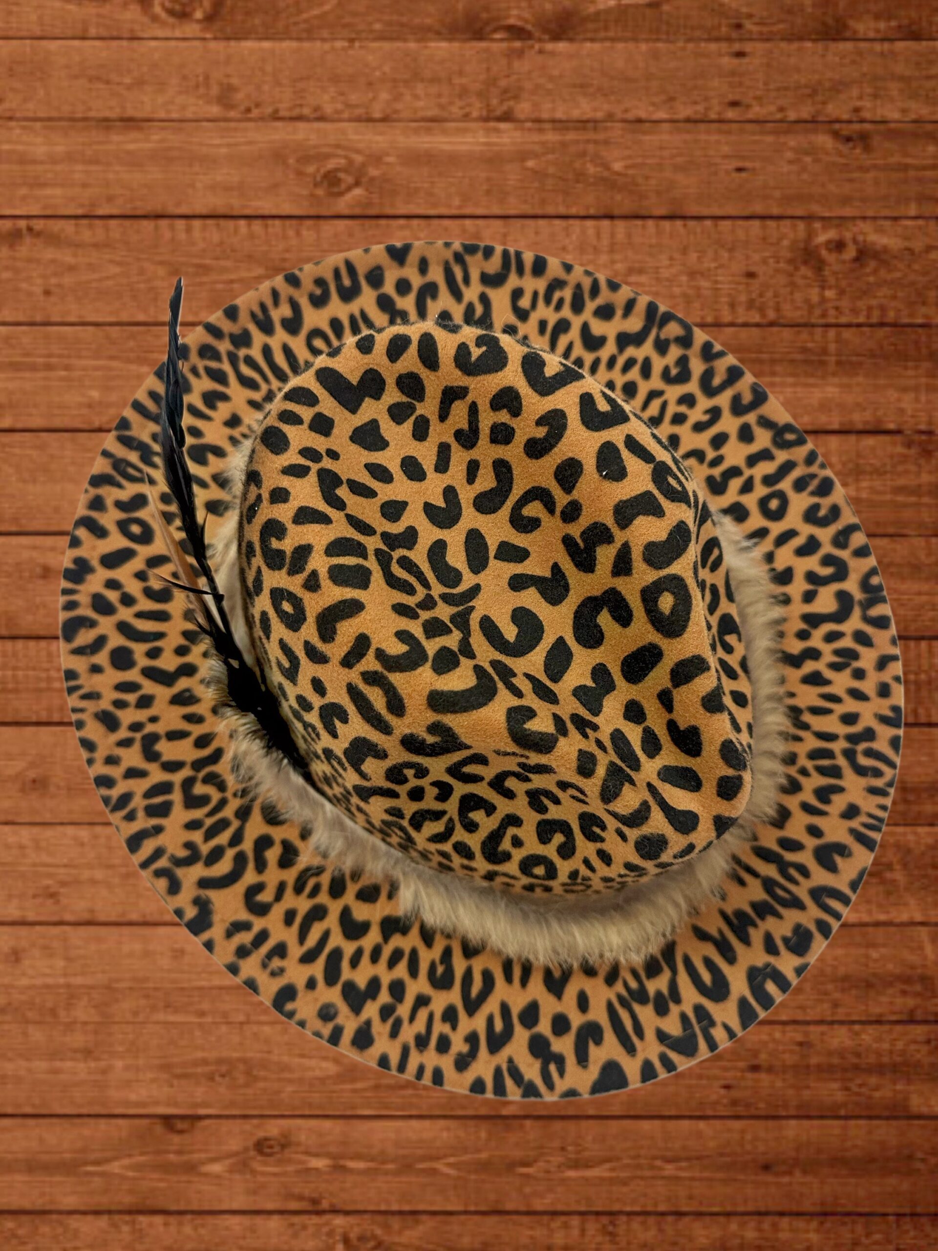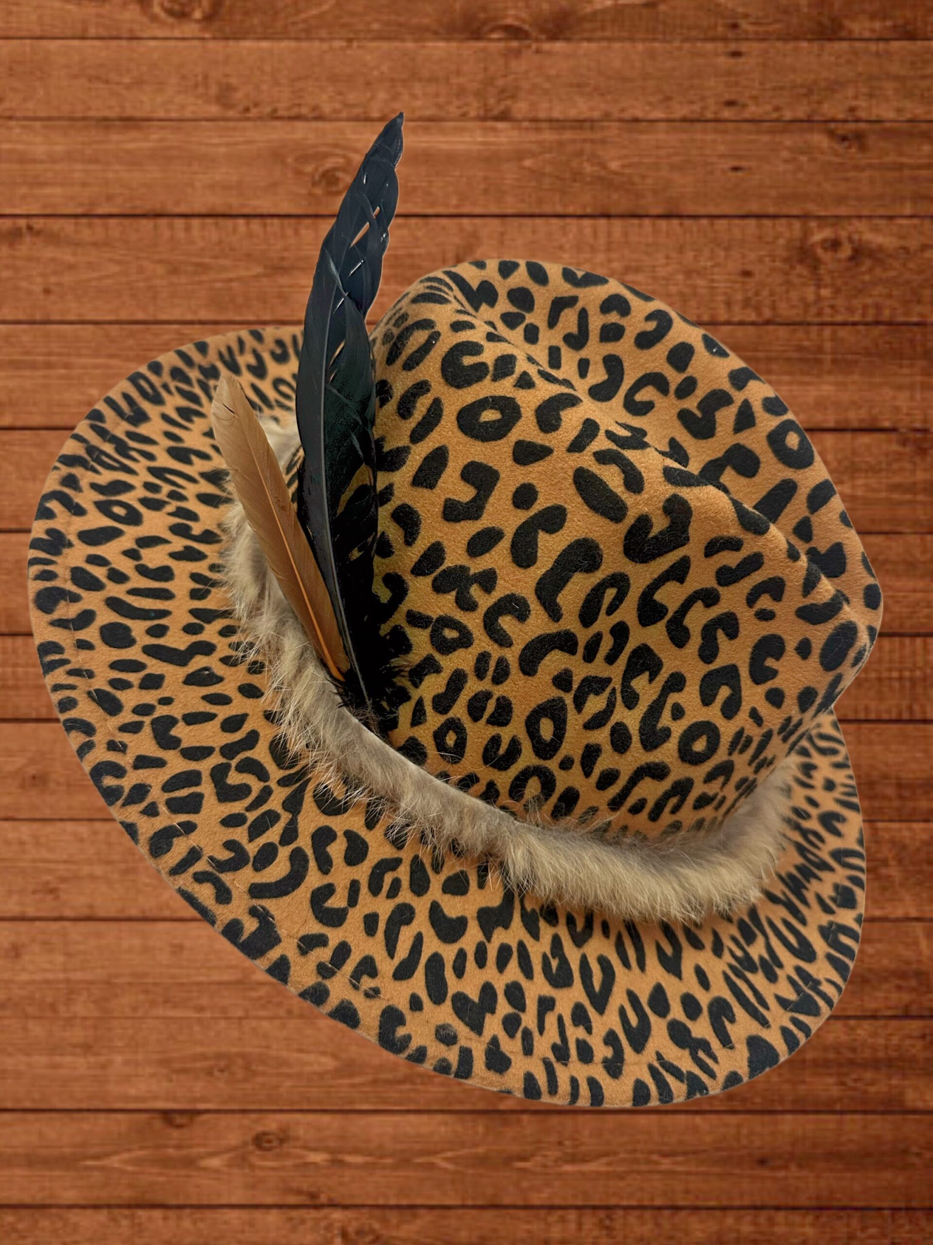 Espectacular sombrero print, cinta de pelitos y preciosas y grandes plumas en el lateral. En la zona posterior de la visera lleva nuestras míticas plumas grabadas. Esto hace que el sombrero luzca de una forma bonita una vez colocado.