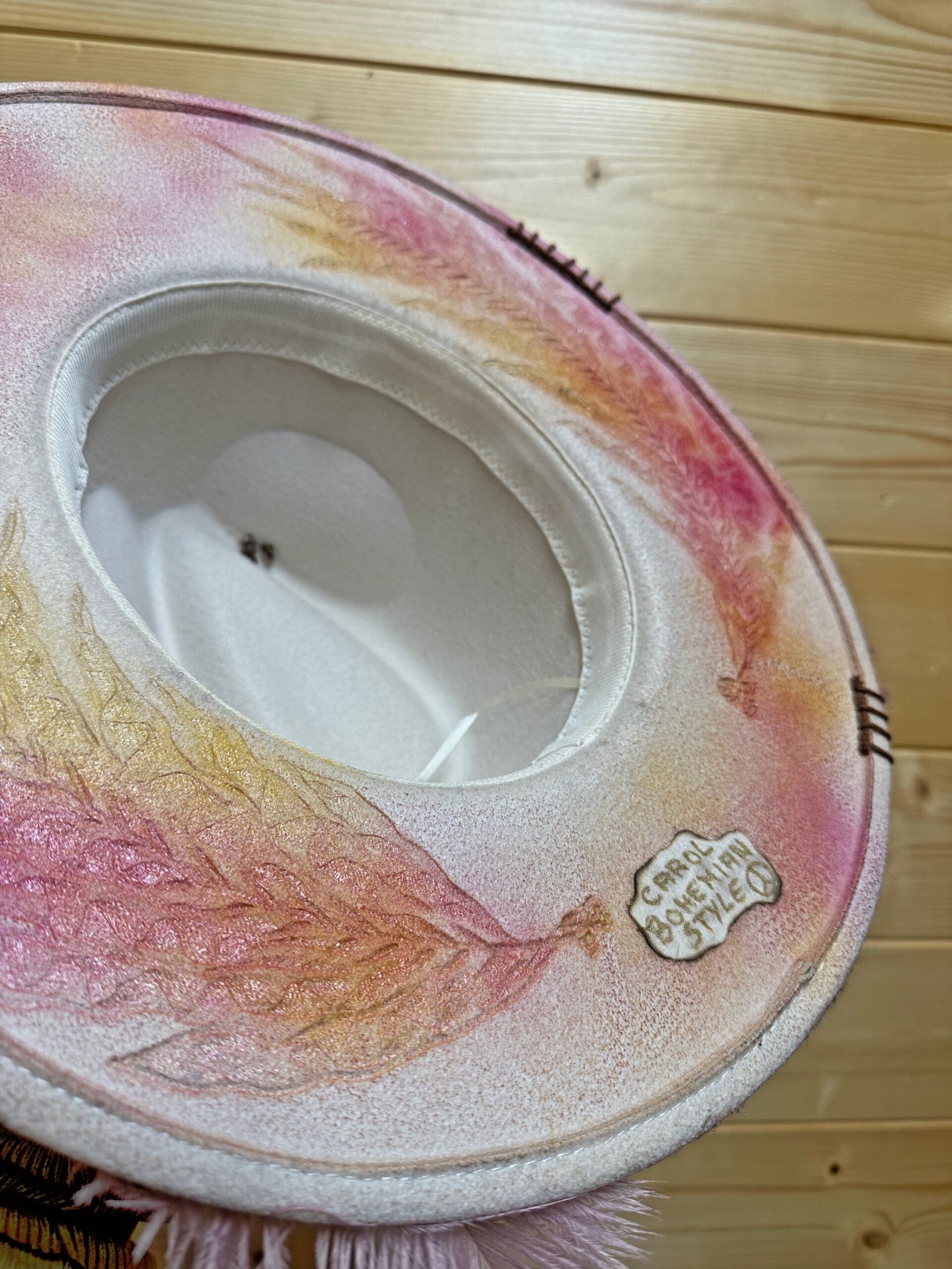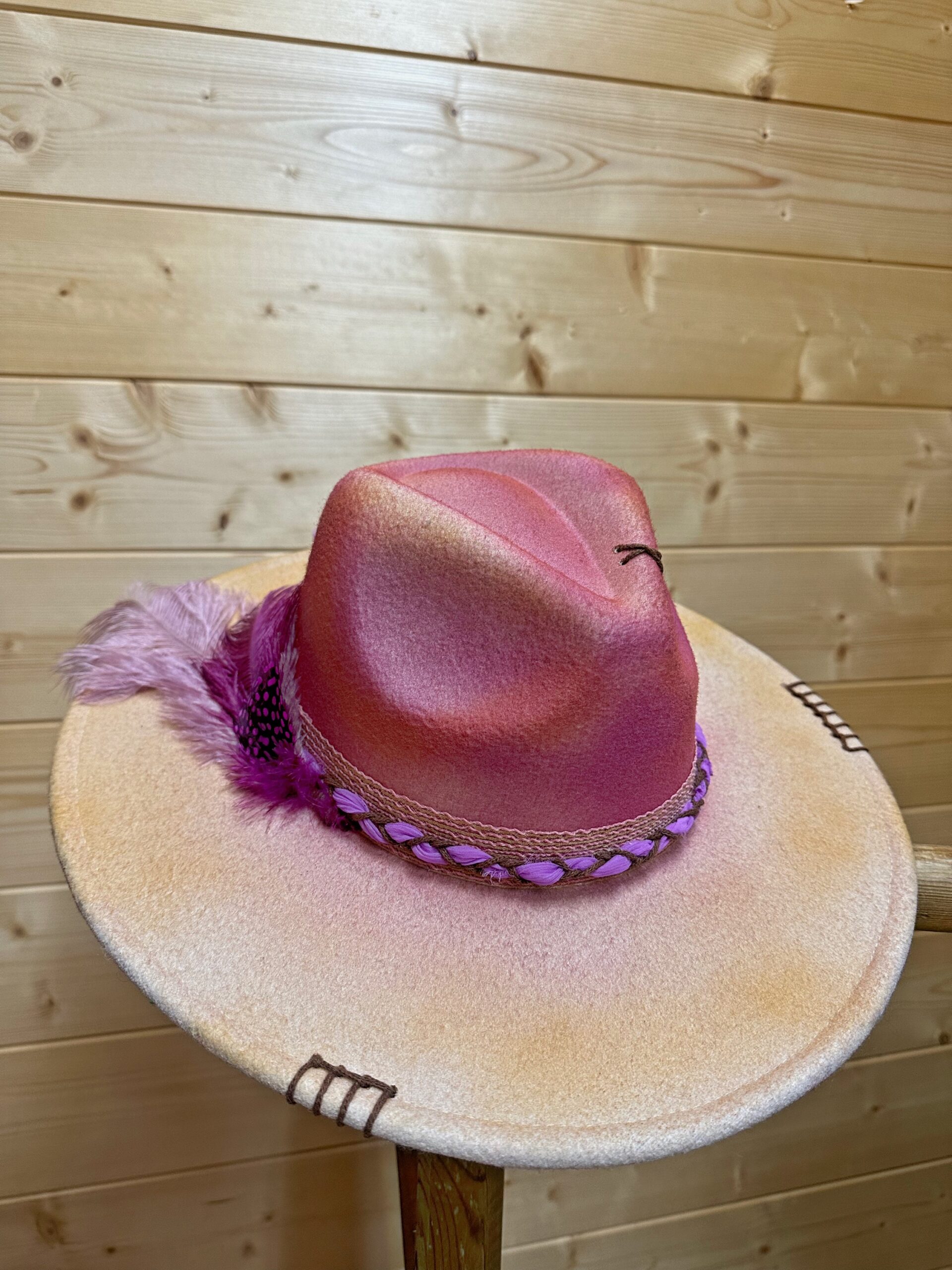 Espectacular sombrero de 100% lana teñido a mano y envejecido. Color Malva, cinta y preciosas y grandes plumas en el lateral. En la zona posterior de la visera lleva nuestras míticas plumas grabadas. Esto hace que el sombrero luzca de una forma bonita una vez colocado.