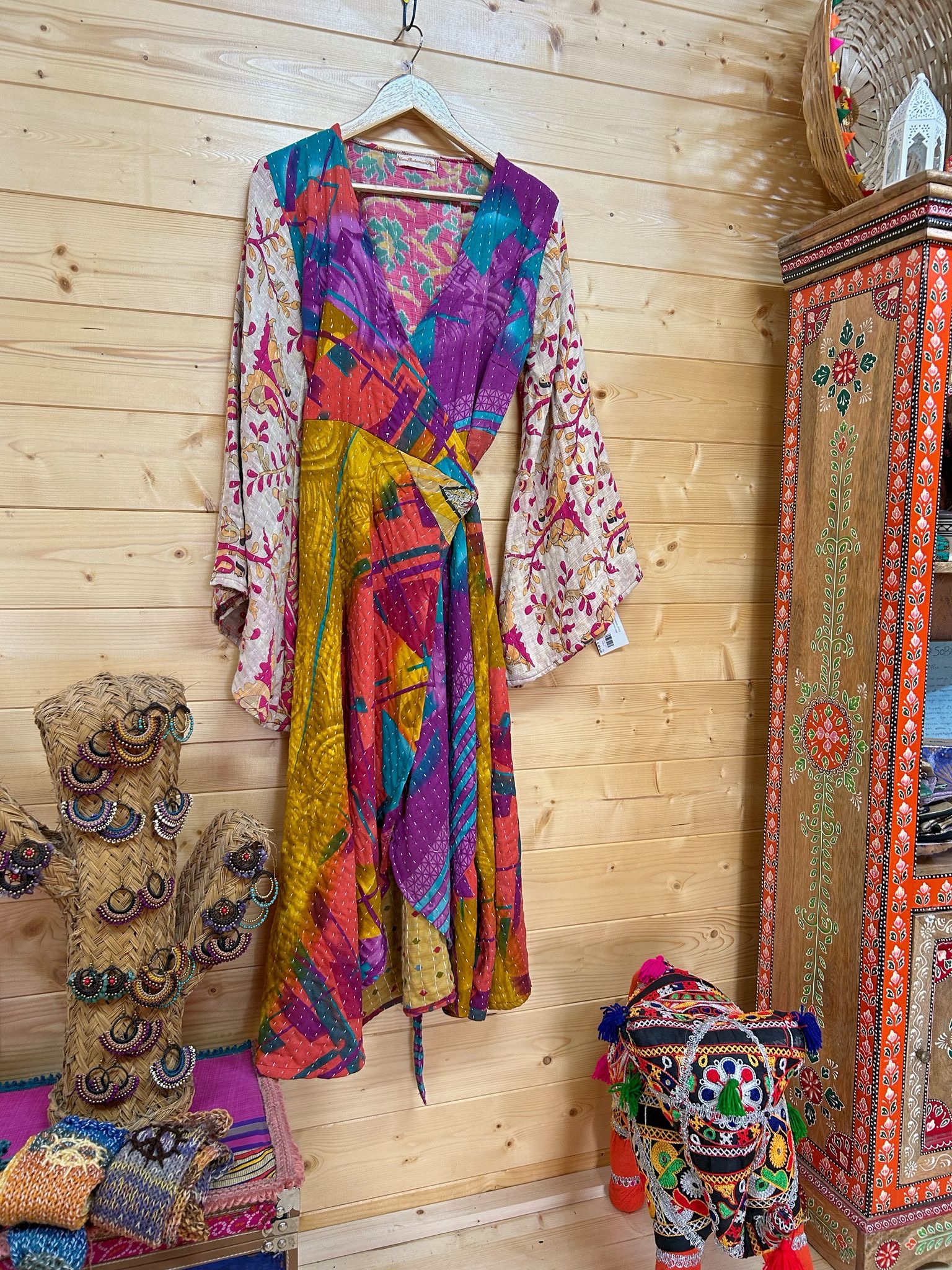 Vestido/kimono cruzado con mangas acampanadas. Algodón reciclado patchwork vintage.