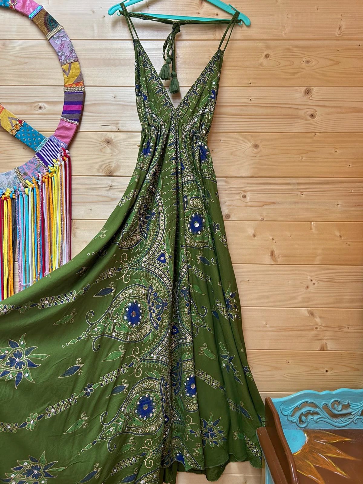 Espectacular, elegante y hippie este vestido de escote en V delantero y en espalda. Talla única
