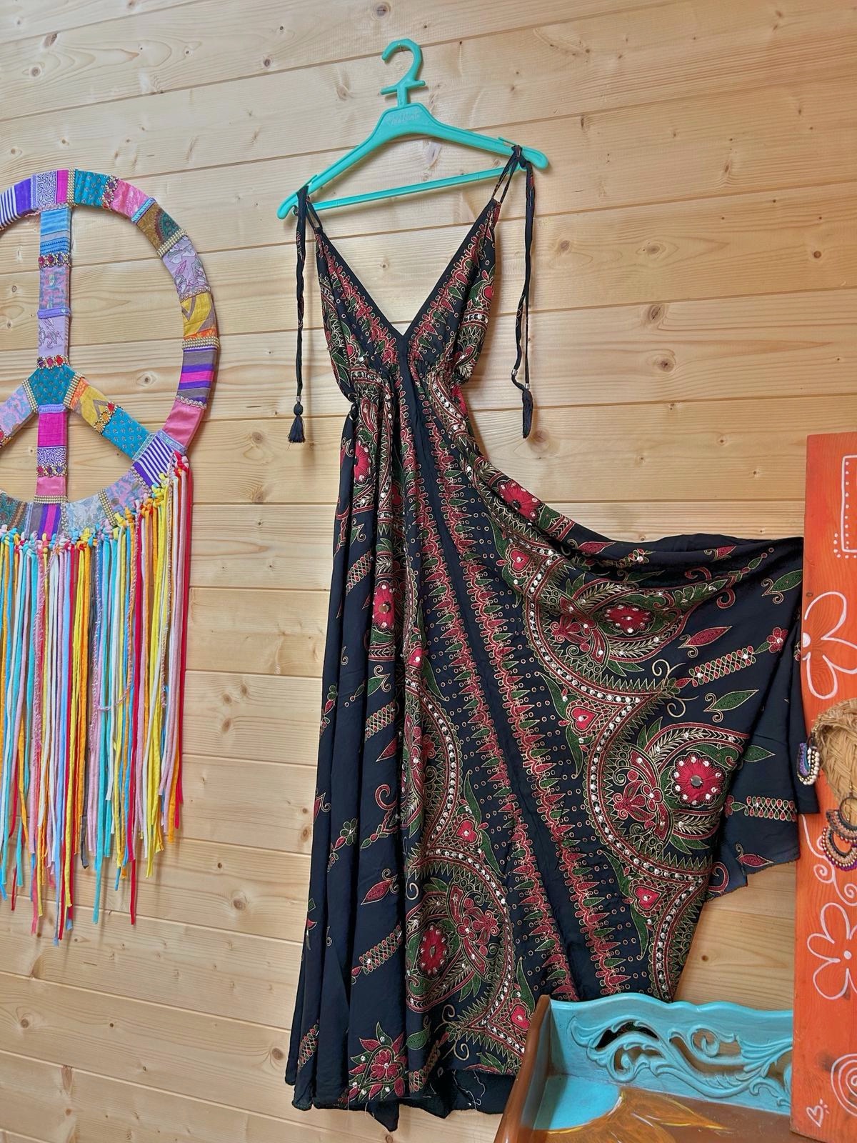 Espectacular, elegante y hippie este vestido de escote en V delantero y en espalda. Talla única