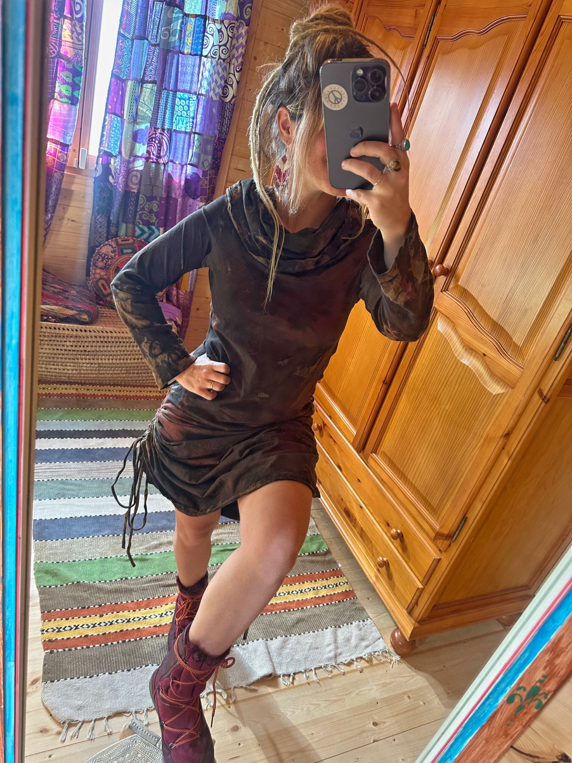 Cañero vestido tie dye con varias formas. Lleva cintas para ajustar en la falda por lo que puedes ponerlo corto o largo. El cuello es bastante amplio para colocarlo con capucha, escote holgado o hombro descubierto.